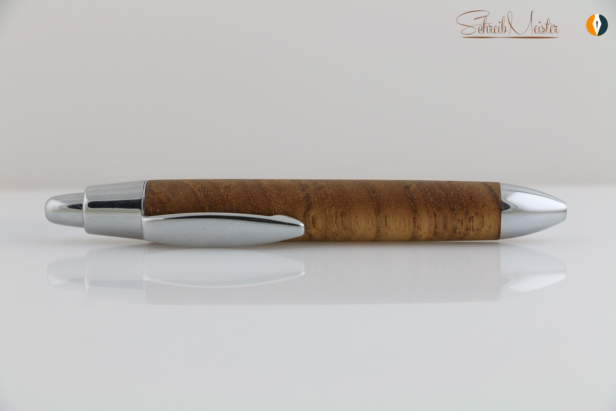 Als Holz wurde für diesen „Scribi« Teak verwendet. Teakholz ist sehr dauerhaft, hart und im Gegensatz zu anderen Tropenhölzern relativ gut zu bearbeiten. Das Holz besitzt einen hellen Splint (das ist der äußere Bereich) von zwei bis drei Zentimetern Stärke. Das Kernholz hat eine gelbe bis dunkelbraune Farbe. Je nach Herkunftsland kann das Holz dunkel-olivbraune bis schwarze Streifen aufweisen. Die interessante Struktur und Zeichnung des Holzes fordert ein Drechseln quer zur Maserung direkt heraus. Der Aufwand des zusätzlichen Schärfens der Drechseleisen wird durch eine wunderbare Holzoptik mehr als belohnt. Wer klassisches, braunes und interessant gezeichnetes Holz liebt, der wird sich mit Sicherheit in Teak verlieben. Der „Scribi« wurde gegen die Maserung gedrechselt und mit speziellen Teak-Öl behandelt, dadurch wurde das Holz etwas heller und farbiger. Es weist beim Drehen einen richtig schimmernden Glanz auf. Dieser Stift wurde nur geölt, man hat den unmittelbaren Kontakt zum Holz.