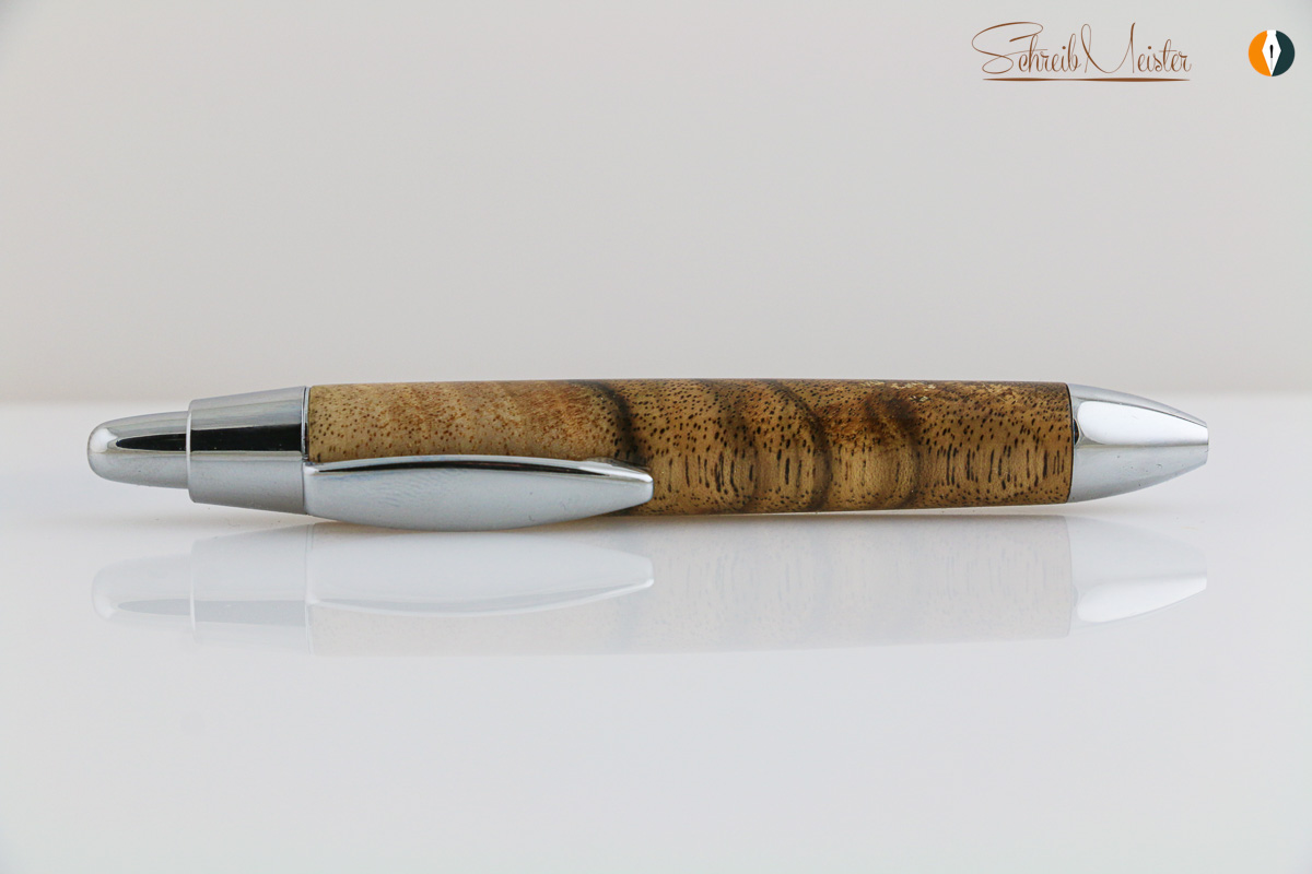 Für diesen »Scribi« habe ich eines meiner Lieblingshölzer verwendet: Zebrano. Es ist so ziemlich das erste exotische Holz, das mir in die Finger gekommen ist und ich bin immer noch begeistert davon. Das schöne, feinporige braune Holz ist durchsetzt mit schwarzen Streifen, die an ein Zebra erinnern, Daher stammt auch der Name. Das Holz für diesen Stift war so homogen und fein, dass ich es naturbelassen habe. Ich habe es lediglich mit etwas lebensmittelechtem Öl eingelassen. Ein toller Kugelschreiber.